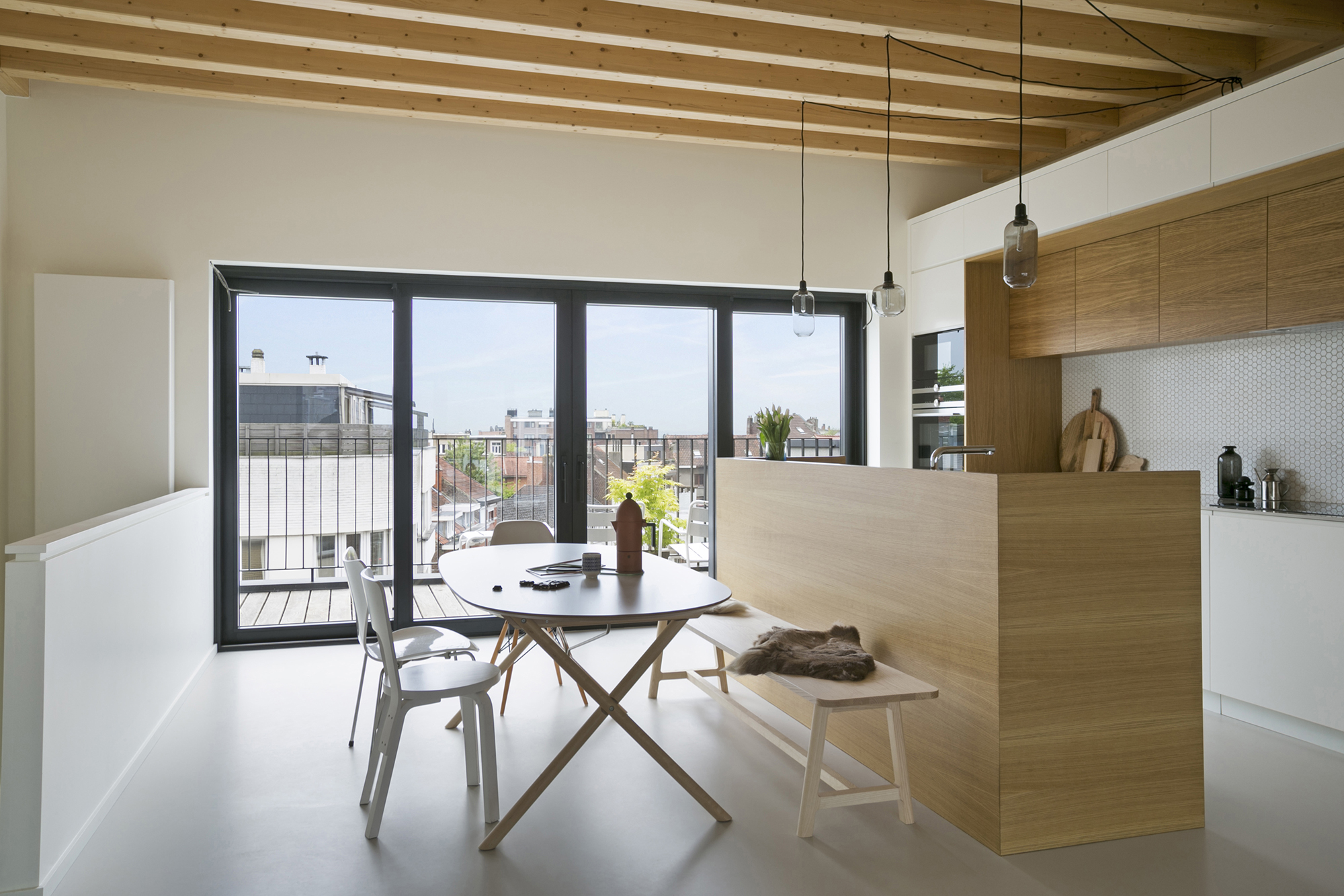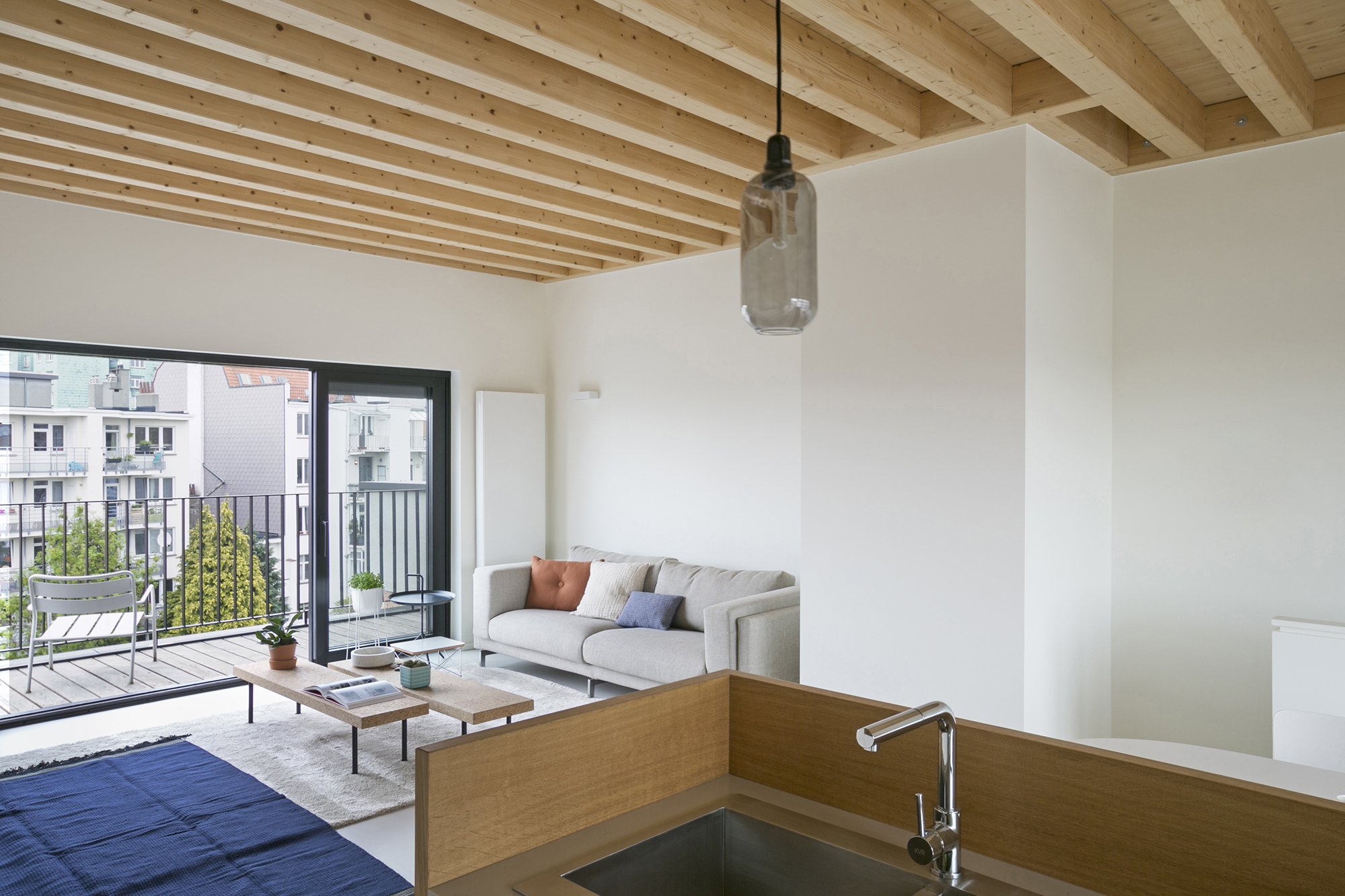 À Uccle, surélévation en ossature bois d’un immeuble existant pour y créer un quatrième logement : un duplex lumineux avec terrasses et vues dégagées sur les toits de Bruxelles.