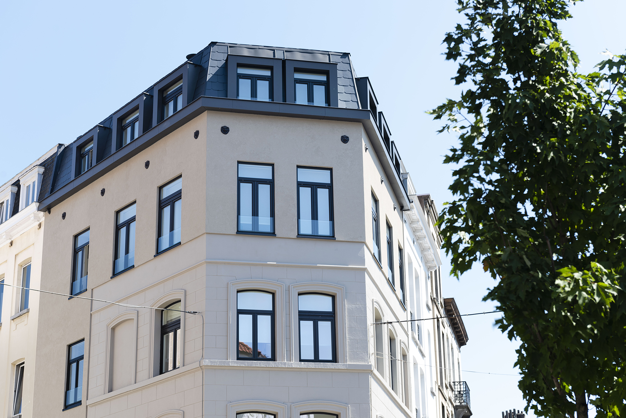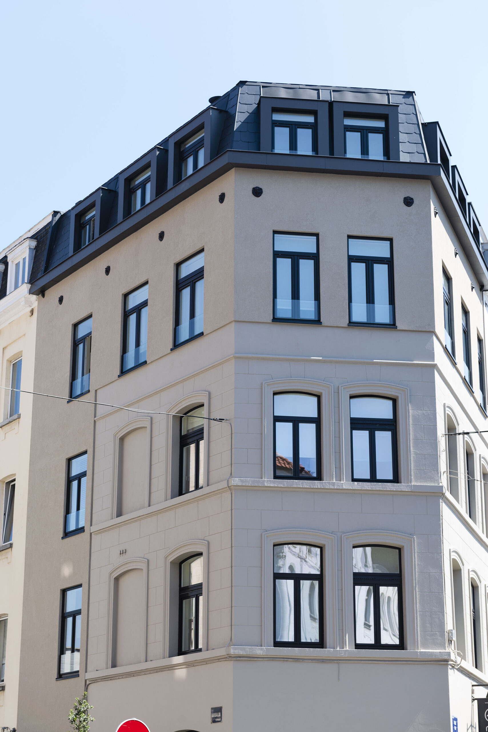 À Saint-Gilles, sur une parcelle d’angle, rehausse d’un immeuble du début du XXe siècle et aménagement d’un restaurant au rez-de-chaussée.